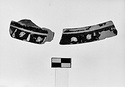 | Description: | From rim of large open bowl with lug handle at edge of rim. Flat-topped rim projecting on inside, with scraped groove near inner edge; two grooves around outside. On top of rim, dots of thinned clay with white centers, between dashes of white. On handle, three deep vertical grooves painted white; dashes of clay between. On wall below, garland. Poor metallic glaze inside and out. ADDENDA Fragments b) and c) from above, showing painted decoration on top of rim. | |