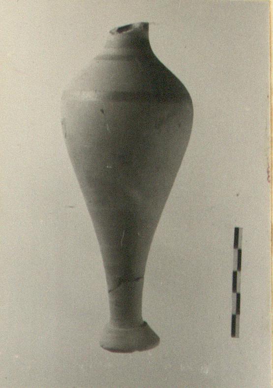 Description:   Rim missing and most of neck; foot chipped. Large unguentarium; inverted pear-shaped, with broad collared foot.