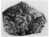 | Description: | Two joining wall fragments broken all around. At bottom, tips of widely spaced leaves preserved; at top, a band of pendent leaves with dots above. In center, a seated figure with a nude figure across his knees. At left, a bearded figure driving left in a chariot. At right, a winged figure driving right in a chariot. Two birds in field. Pinkish-buff clay. Somewhat metallic glaze, worn in places. | |