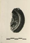 Description:   Half preserved giving whole profile. Cylindrical body. Lower flange at standing level, slightly bevelled. Very low ring foot. Upper flange just below rounded top. Very small round opening, surrounded by groove on top. Covered all over by black glaze. On top round opening pattern consisting of a couple of vertical strokes in white alternating with pairs of horizontal strokes in diluted clay.