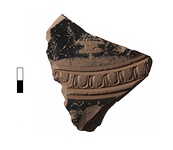 Pinkish-buff clay. Black glaze inside and out except for moulded band which is reserved.