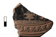 A band of moulded egg and dart around center of fragment with decorated surfaces above and below. Above: a kernos in very heavy added clay with a branch through the handle and another to left. Below: an indeterminate object in added clay.