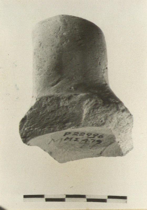 | Description: | The upper part of the handle and a little of the wall of a storage amphora or pitcher. Incised under handle: <graphic> A streak of thin brown glaze on the top of the handle; pinkish clay with white bits. | |