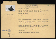 | Description: | About half preserved; the handle broken off, and most of the lip. Plump spreading body with offset at shoulder; narrow neck; out-turned lip; ring foot. Inscribed beneath, within foot. Good metallic black glaze all over except on underside. | |