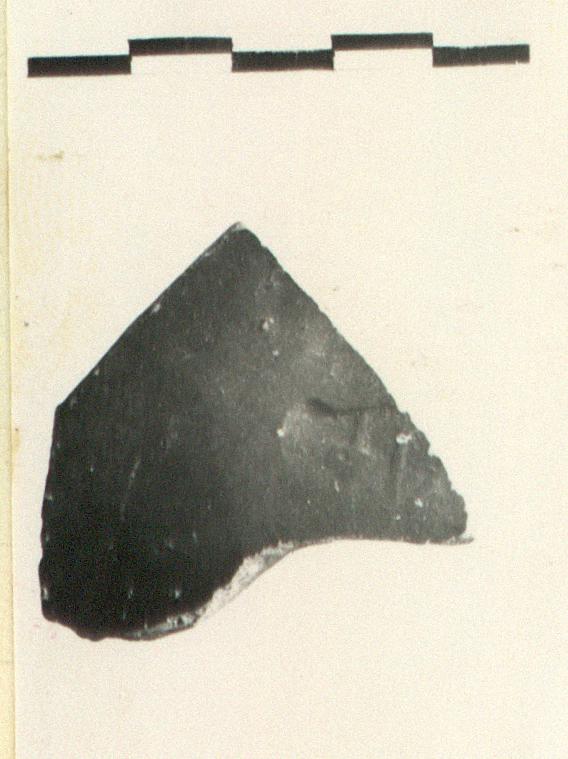 | Description: | Broken all around. Piece from floor of plate or bowl; or front flat wall of canteen(?). Stamp broken away at one end: <graphic> Reddish-buff clay. Black glaze on stamped side; other side mostly uglazed, but with a drip of dull glaze near edge. | |