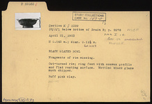 | Description: | Fragments of rim missing. Out-turned rim; ring foot with convex profile and flat resting surface. Mottled black glaze much chipped. Buff-pink clay. | |