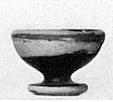 | Description: | Piece missing from foot, chip from rim. Thickened plain rim set off by a groove; torus foot with slightly concave upper surface and angular resting surface. Glazed except profile of foot, resting surface and center of hollowness of foot. Pinkish-buff clay; unevenly fired glaze from black to light brown; much worn. | |