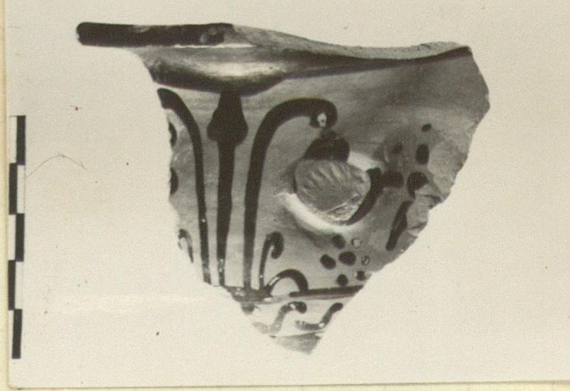 | Description: | Part of rim, body and root of one handle preserved. Overhanging rim. Rim glazed. Palmettes and rosettes, band of "running dog" pattern below it on body. Reserved band in handle space. Light brown, whitish clay. Dull glaze fired light brown inside. ADDENDA: could very well be of Euboean origin; fabric (glaze and red ochre as well as some of the deco) are also known in Euboea, see URE 1962 (C. Gamma, 12.04.2018). | |