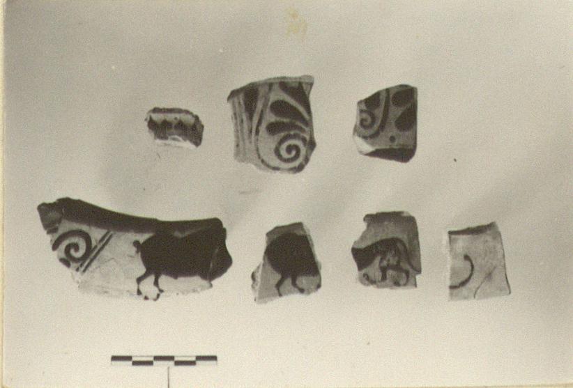 | Description: | Six non-joining rim and handle-plate fragments. On rim, pigs and lions; on handle-plates, palmettes. On vertical face of rim, two series of ivy leaves divided by a line. Pinkish-buff clay; glaze unevenly fired from black to yellowish. | |