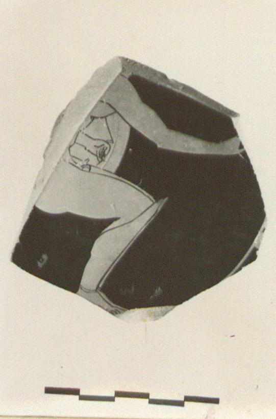 | Description: | Part of tondo and stump of stem preserved. Head, back, part of feet and fingers missing. Hoplitodromos, shield in left hand preparing to race, standing with feet together and right arm extended. Relief contour; inscription in red. Pinkish-buff clay fired gray in places; good glaze. | |
