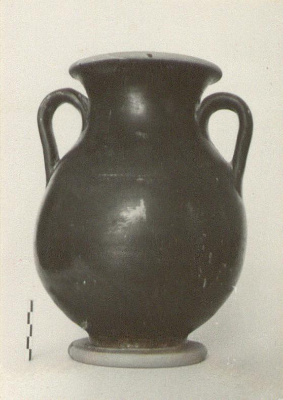Description:   Small chip off lip, large fragment off foot, restored in plaster. Plain outcurving rim, flat handles, disk foot with narrow resting surface, sloping inner face, convex bottom. Two scraped grooves border a flat ring at the junction of the foot. Glazed except rim, profile and underside of foot. A couple of red lines at the level of lower handle attachment, passing actually over it; one red line at base of neck. Neck glazed inside.