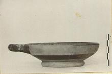 | Description: | Intact except small chips. Inturned rim; ring foot with concave outer face, almost vertical inner face and very slightly concave bottom; flattish handle. Inside glazed except a reserved medallion with two concentric circles and a dot in the center. Rim above, handle outside, inner face of ring foot glazed. A broad glazed band below handle. Circles and dot in center of bottom. Pinkish-buff clay; glaze fired mostly brown. | |