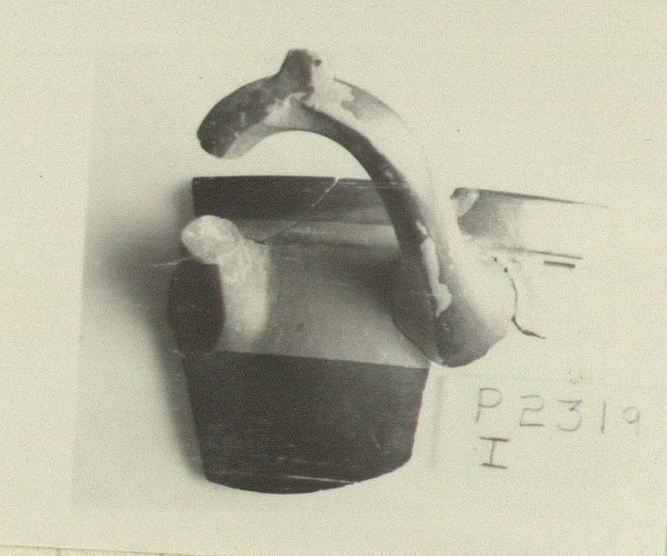 | Description: | Mended from four pieces. Most of the handle and a small part of the rim and side preserved. The inside of the "wish bone" handle and the space below it are reserved. Raised ridge below rim. Good glaze. | |
