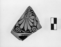 | Description: | Neck fragment; broken all around. One palmette and spirals from lyra on each side of it, from the upper neck zone of a large volute krater: double palmette, with ribbed petals alternating with double lyra. Relief outline. Light red clay. Very good glaze. | |