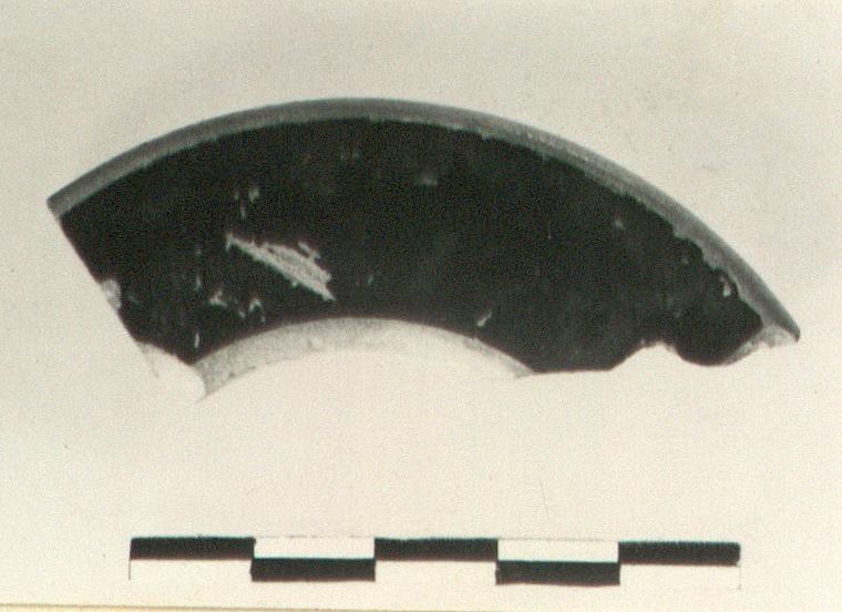 | Description: | About one-third preserved. Glazed, save for inner and outer edge. Attic clay. Glaze fired black to gray. | |