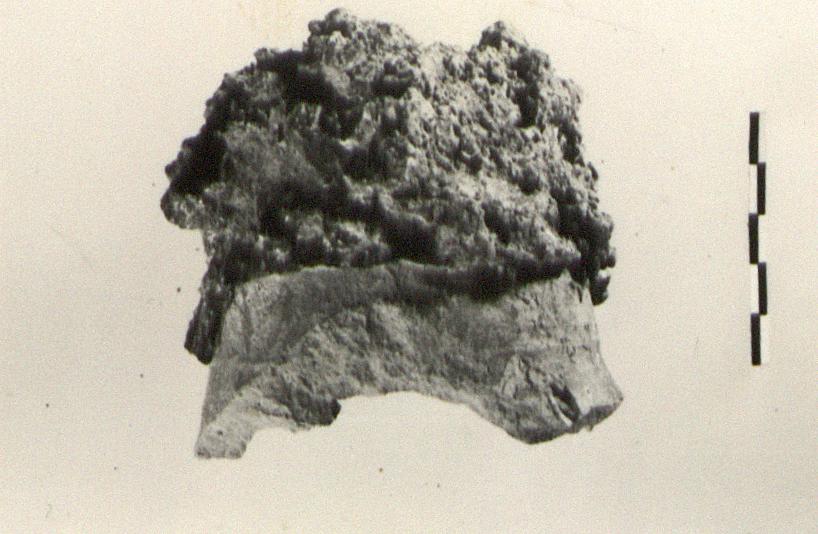 | Description: | [Originally identified as Amphora Mouth] Mouth only preserved. Thickly coated with a rough mass of bronze as though it had been dipped into the molten metal. Several other such amphora(?) mouths, coated with bronze in the same way, were found in other parts of the same fill. Dark red clay, unglazed. | |