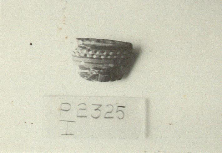 | Description: | Fragment from side and shoulder; a tiny bit of the shoulder showing rays. As top border of scene, alternating rows of dots, white applied over black. Head of man right, head of donkey left, forepart of head of rider left. White accessories. Possibly belongs with P 53. | |