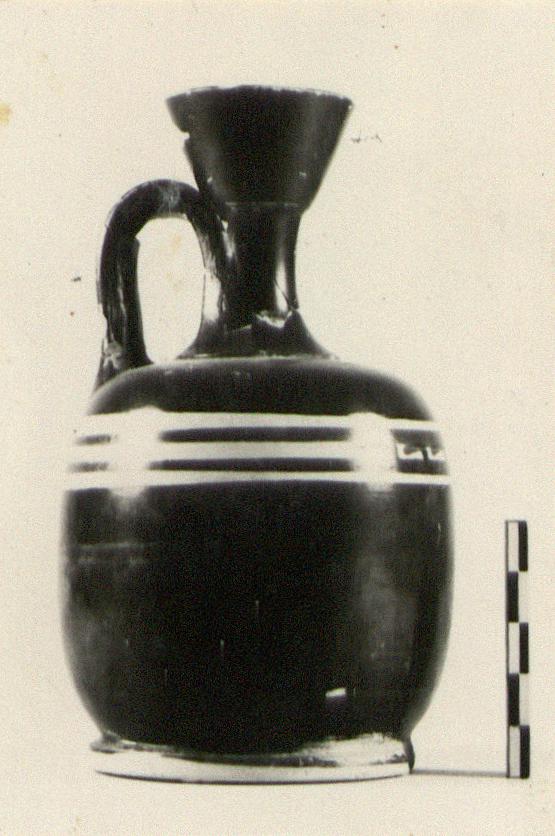 | Description: | Mended from several pieces; foot chipped. Ring base with narrow resting surface; squat body; narrow shoulder; spreading neck, low step down. Three reserved bands around shoulder with running dog in central one. Edge and bottom of base reserved. Pinkish-buff clay. Good black glaze. | |