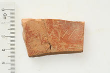 | Description: | Two joining sherds from a flat-bottomed saucer with thin red glaze on inside and out. Three lines of a graffito, of which original left ends preserved; broken at right; a list?: <graphic> | |