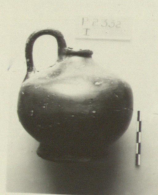 | Description: | Mouth and much of neck missing. Globular body, ring foot. Graffito on bottom: Χ Poor glaze, much chipped over entire vase. Cf. Agora XII, no. 1105. | |