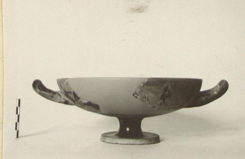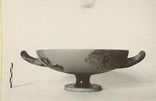 | Description: | Much of rim, wall and floor and part of one handle missing and restored. Plain rim; disk foot with deep cone at center beneath. On exterior, both sides, seated Dionysos with satyrs and maenads(?); branches in field. Interior, dancing satyr. Glaze inside good; fired brown from stacking in the medallion; much peeled on upper part of exterior. Reserved line at edge of lip inside; vertical face of foot, resting surface and cone reserved; a glazed line around the cone at the bottom. Coarse sketch incision; some added red. | |