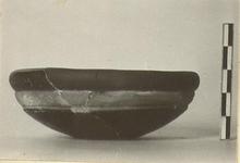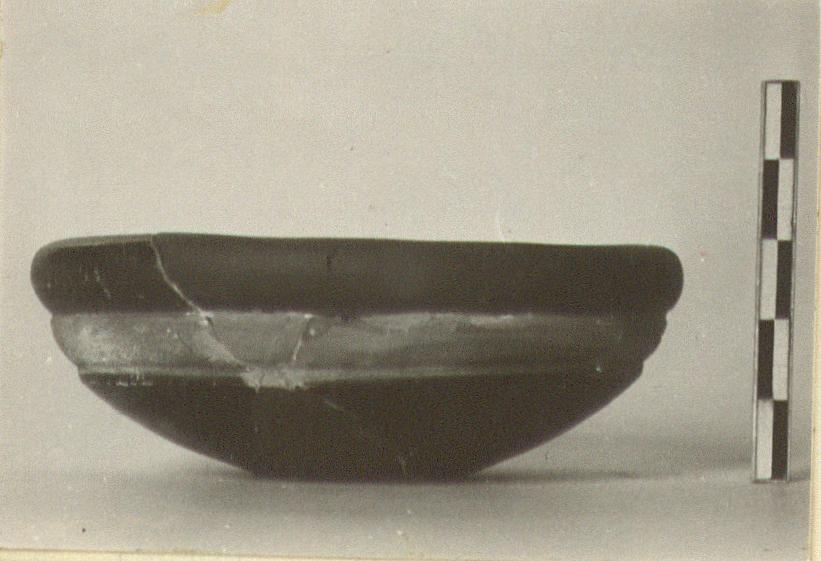 | Description: | About one-third of bowl preserved; foot missing. Two non-joining fragments, put together with plaster. Thick incurved rim, a reserved ridge with traces of dilute glaze, below it. Good glaze. | |