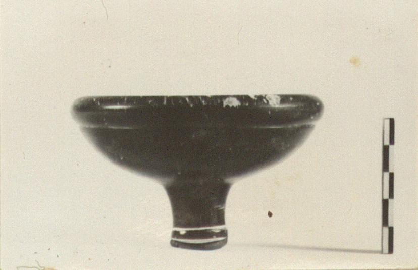 | Description: | Base missing. Thickened lip set off outside by a groove. Two scraped lines around stem just above base. Firm black glaze. | |