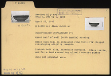 | Description: | About half of wall, with handle, missing. Small open bowl on simulated ring foot; flat-topped rim sloping slightly inwards. Pinkish-buff clay, carefully surfaced. Glaze inside, and for a band around top of wall outside, rather dull and somewhat worn. | |