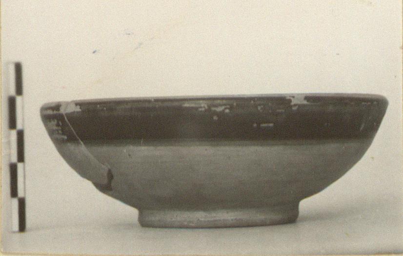 | Description: | About half of wall, with handle, missing. Small open bowl on simulated ring foot; flat-topped rim sloping slightly inwards. Pinkish-buff clay, carefully surfaced. Glaze inside, and for a band around top of wall outside, rather dull and somewhat worn. | |