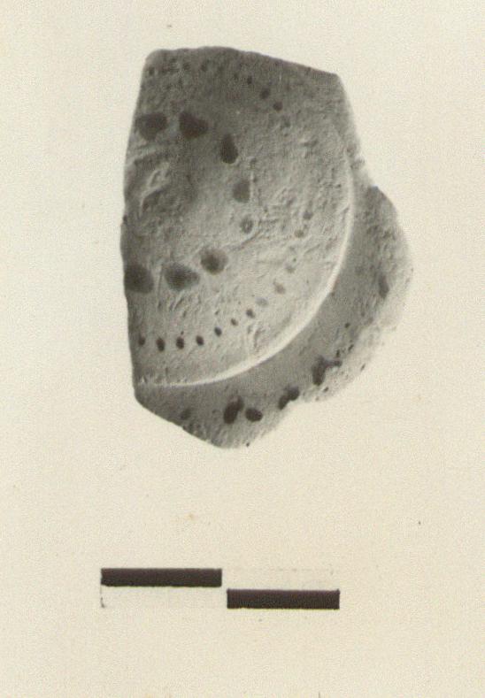 | Description: | Nearly half the lid for a very small pyxis. Domed top; wide projecting rim; short vertical flange; traces of knob, broken off. Decoration in orange-brown glaze; on the top, two rings of dots and a narrow band; on the rim, a row of small inverted V's. Both patterns probaby rough ivy leaves. Thin fabric; light buff micaceous clay. | |