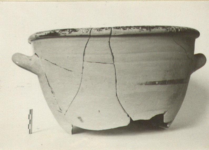 | Description: | Mended from many pieces; the walls largely complete, to near the base. Narrow rolled rim; handles slightly uptilted. Glazed on interior and on rim; red to black, much worn. A band of dilute glaze around the wall just below the handles. | |