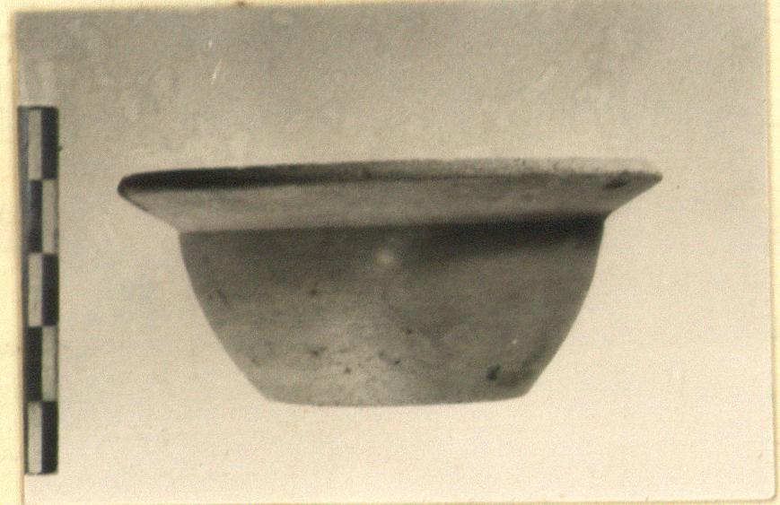 | Description: | Mended from two pieces; chips from rim and body missing. Broad, slightly flaring rim; convex body; flat bottom. Pinkish-buff clay. Purple applied over orange glaze on rim. Glazed inside only. Narrow reserved band at inner edge of rim. Glaze worn. | |