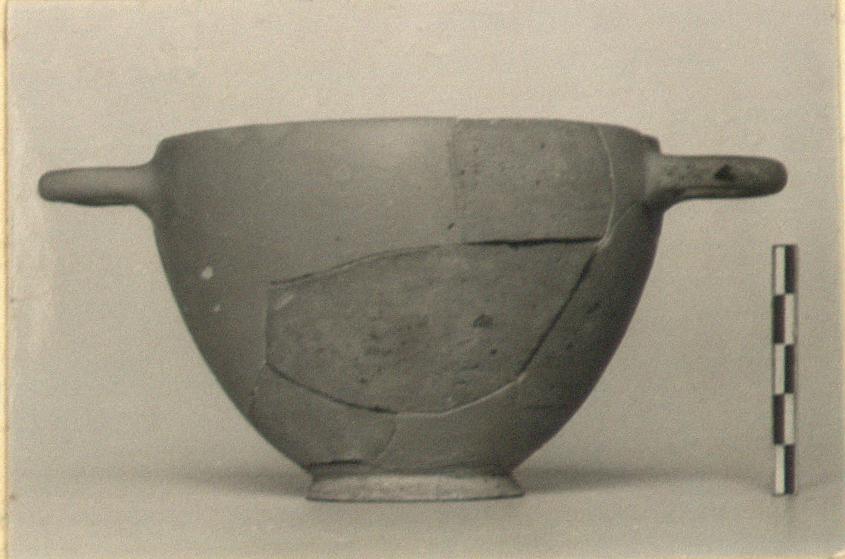 | Description: | Mended from many pieces; one handle, parts of body and rim missing and restored. Profile complete except for center of floor. Short rays above base. Glazed band on underside of foot. Yellowish-white clay. Small traces only of black. Protocorinthian. | |