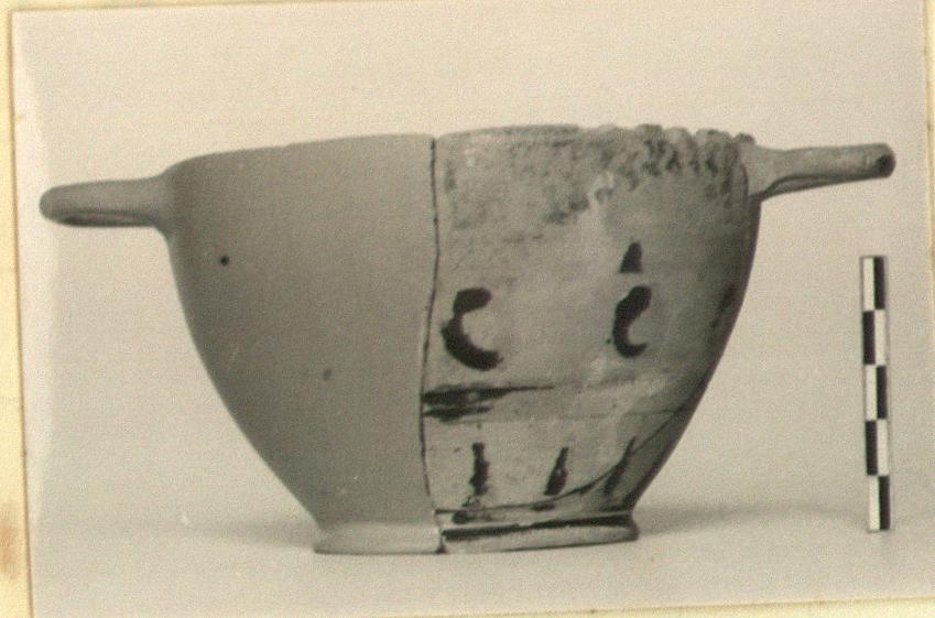 | Description: | Mended from three pieces; less than half preserved, including one handle; profile complete; restored in plaster. On exterior, three zones, separated by bands of purple between black lines. Top zone: vertical zigzags; middle zone: thick circles; bottom zone: rays. Band of glaze on outside and inside the pseudodisk foot. Circle of glaze in center beneath. Streaky glaze inside. Pinkish-buff clay. Black glaze, much worn on exterior. | |