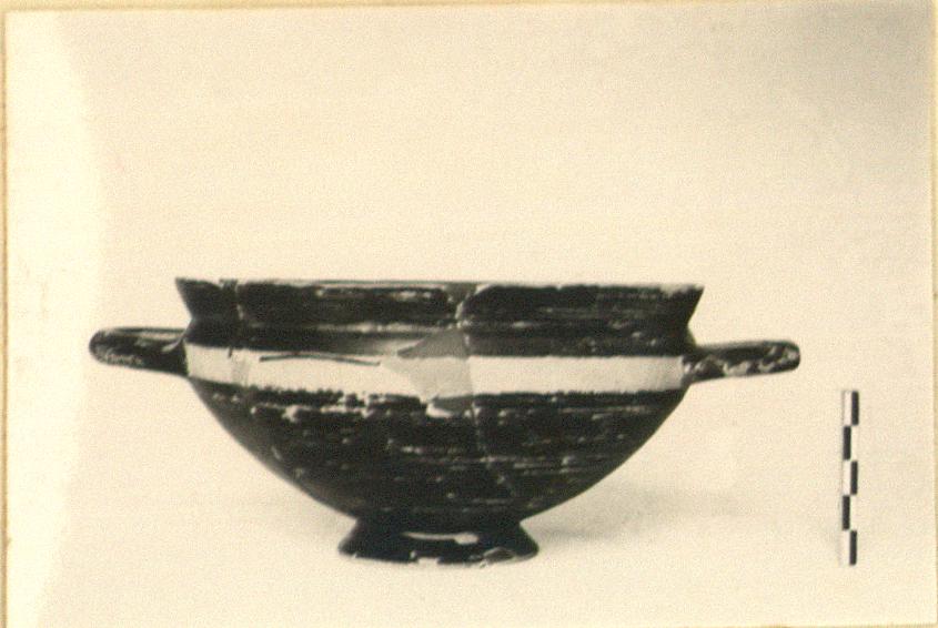 | Description: | Mended from many pieces; parts of body and rim restored in plaster. High, flaring ring foot; pointed body; high, slightly flaring rim, sharply broken profile; handles little below rim. Glazed all over except for handle zone. Beneath, three concentric circles and glaze band on inside of ring foot. Brown line(?) on inside join of rim and body. Pinkish-buff clay. Flaky black glaze. Imitation of Ionian cup. | |