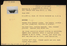 | Description: | Mended from several pieces; one handle, profile and foot preserved; restored in plaster. Low disk foot, concave beneath; low, rounded profile; handles just below rim. Two broad concentric glazed circles on underside. Handle zone reserved; below it, applied purple, bounded by white lines. Inside, just below rim, half way down and on floor, same decoration. Pinkish-buff clay. Glazed inside and out; much flaked black glaze. | |