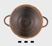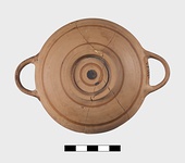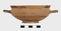 | Description: | Mended from many pieces; parts of rim restored in plaster. Low ring foot; very pointed, shallow body; high flaring rim, sharply offset; handles at greatest diameter. Glazed inside except for reserved band at junction of rim and wall. Two purple circles at center of floor. On outside, rim, handles glazed. Two narrow glazed bands on lower part of body, and outside and inside of ring foot glazed. Two concentric circles beneath. Pinkish-buff clay. Thin metallic fabric. Streaky brown to black glaze. | |