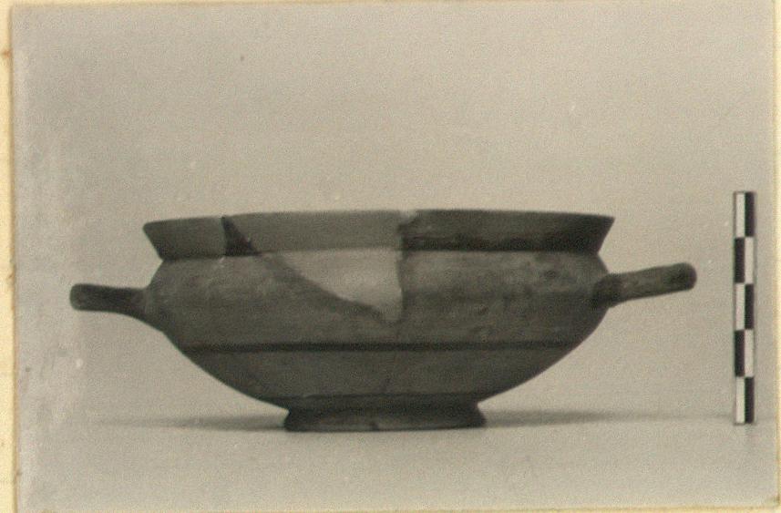 | Description: | Mended from many pieces; parts of rim restored in plaster. Low ring foot; very pointed, shallow body; high flaring rim, sharply offset; handles at greatest diameter. Glazed inside except for reserved band at junction of rim and wall. Two purple circles at center of floor. On outside, rim, handles glazed. Two narrow glazed bands on lower part of body, and outside and inside of ring foot glazed. Two concentric circles beneath. Pinkish-buff clay. Thin metallic fabric. Streaky brown to black glaze. | |