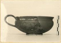 | Description: | Mended from four pieces; part of body and rim restored in plaster. Low disk foot; pointed body; flaring, offset rim; band handle attached at rim. Glazed all over except for foot, reserved circle on floor and triangle on top of handle. Pinkish-buff clay. Mottled red-black glaze. | |