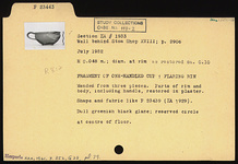 | Description: | Mended from three pieces; parts of rim and body, including handle, restored in plaster. Shape and fabric like P 23439 (ΣΑ 1929). Dull greenish-black glaze; reserved circle at center of floor. | |