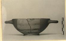 | Description: | Mended from four pieces; most of rim and body missing, with both handles; restored in plaster. Shape and decoration apparently like P 23445 (ΣΑ 1935), but with broader glaze bands and five instead of four. Flaky glaze. | |