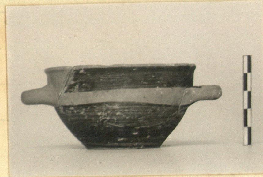 | Description: | Mended from three pieces; one handle and part of body restored in plaster. Similar in shape and decoration to P 23434 (ΣΑ 1924), but slightly deeper and narrower, and without a reserved band above the foot. Streaky brown to black glaze. | |