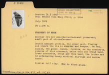 | Description: | Fragment from neck; neither rim nor shoulder attachment preserved; small part of circumference. Double concave profile, the upper part, flaring out toward the rim is shorter and deeper. On top, inside, two glaze bands. Outside, on top concavity, remains of blob ornament; below thin and broad band. Lower concavity, broad and thin band, the latter met by alternating heavy vertical zigzags and narrow bands. Pinkish-buff clay. Red to black glaze. | |