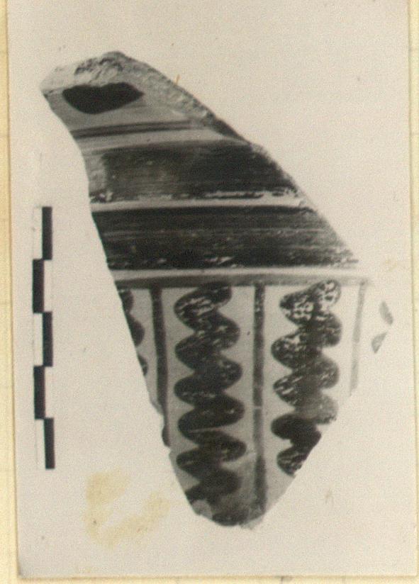 | Description: | Fragment from neck; neither rim nor shoulder attachment preserved; small part of circumference. Double concave profile, the upper part, flaring out toward the rim is shorter and deeper. On top, inside, two glaze bands. Outside, on top concavity, remains of blob ornament; below thin and broad band. Lower concavity, broad and thin band, the latter met by alternating heavy vertical zigzags and narrow bands. Pinkish-buff clay. Red to black glaze. | |