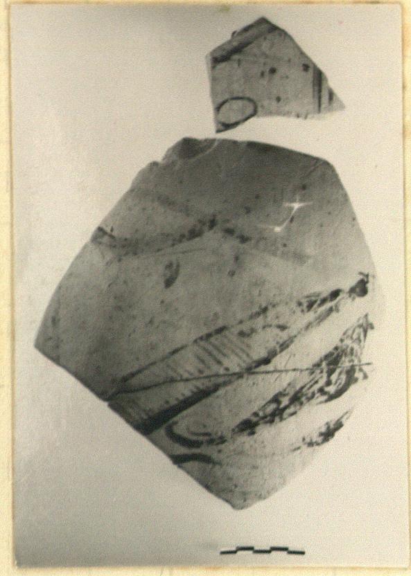 | Description: | Two non-joining fragments from a closed pot only preserved. a) Mended from two pieces, convex. Standing on glaze band, to right, large loop; center, large long hatched triangle; to left, hooked spiral and uncertain ornament. b) Very slightly convex. At bottom two lines; standing on these, double loop. Left top, ellipse. Pinkish-buff, heavy fabric. Blotchy, worn brownish glaze. | |