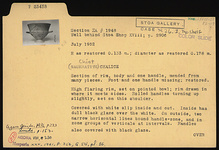 | Description: | Section of rim, body, and one handle, preserved; mended from many pieces; foot and one handle missing; restored in plaster. High flaring rim, set on pointed bowl; rim drawn in where it meets sides; rolled handles turning up slightly, set on this shoulder. Covered with white slip inside and out. Inside has dull black glaze over the white. On outside, two narrow horizontal lines bound handle zone, and in zone groups of verticals at intervals. Handles also covered with black glaze. Pinkish-white thin fabric. Slip applied unevenly. Dull black glaze. | |