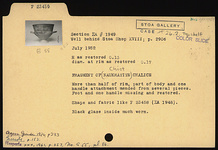 | Description: | More than half of rim, part of body and one handle attachment preserved; mended from several pieces; foot and one handle missing and restored in plaster. Shape and fabric like P 23458 (ΣΑ 1948). Black glaze inside much worn. | |