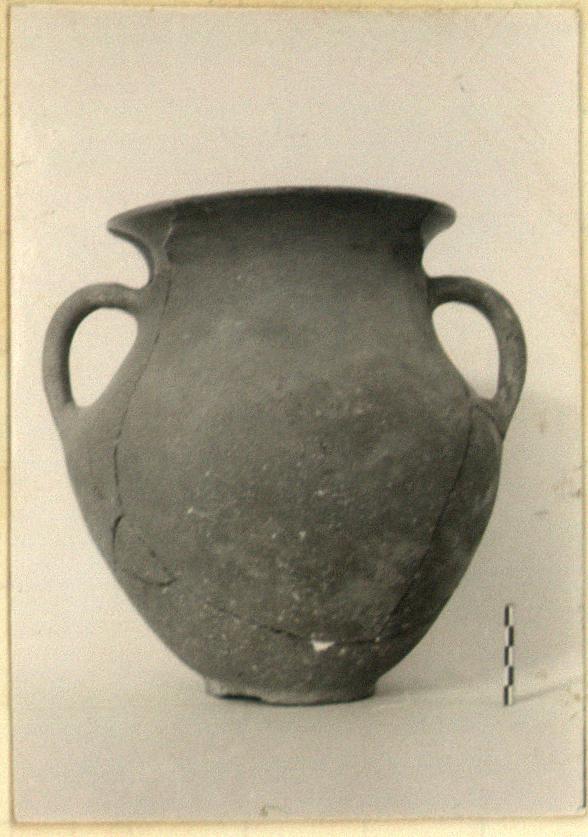 | Description: | Mended from many pieces; parts of rim and body restored in plaster. Low vertical ring foot; wide neck, profile continuous with body; spreading rim; vertical handles set on shoulder, with thumb marks. At about middle of wall on one side, near point of greatest diameter, a small hole, apparently chipped through, with a dark stain around it. Russet clay with gray core; brownish surfacing. | |