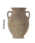| Description: | Mended from many pieces; parts of rim, body, one handle restored in plaster. Flaring ring foot; ovoid body; short neck; rolled rim; band handles at shoulder. Light buff clay. Covered inside and out with white surfacing. Four narrow bands of glaze on body, broader one on base. Vertical wavy line on handle. Black to brown glaze almost entirely worn off. Whitish surfacing much flaked. | |