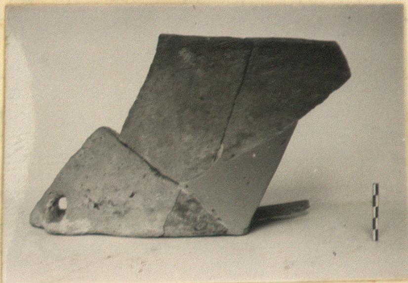 | Description: | Many pieces preserve oval end with drain; some non-joining pieces. Vertical sides thickening at base with unevenly rounded rim; flat bottom; hole at base of side wall, sloping to outside. Inside and rim covered with uneven brown to black glaze. Rough fabric, pinkish-buff, showing traces of straw binding underneath. | |